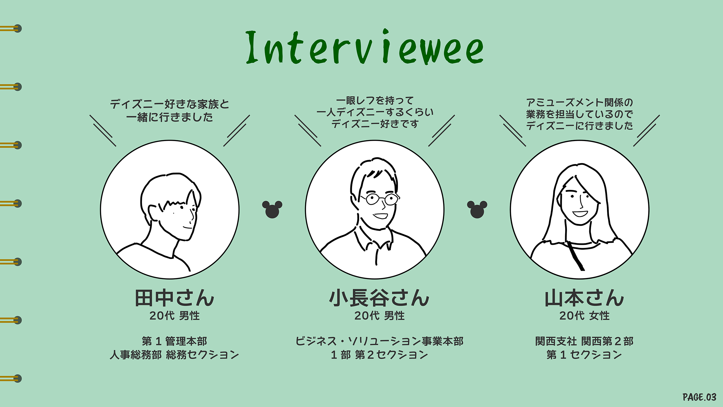 今回、感動体験の舞台として東京ディズニーリゾートを選んだ田中さん、小長谷さん、山本さんの3人の社員に同時インタビューを実施しました。