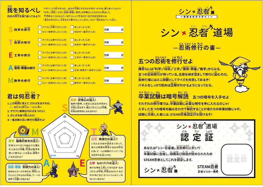 「シン・忍者展」とは、「科学」「技術」「工学」「芸術・教養」「数学」の各項目ごとに設けられた忍術修行を通して、自分の適性を見極めつつ忍者マスターになろうという企画展。シンプルに言うと、忍者についての学びと体験を通じて、自分を見つめ直し適正を知ろう!というものです。