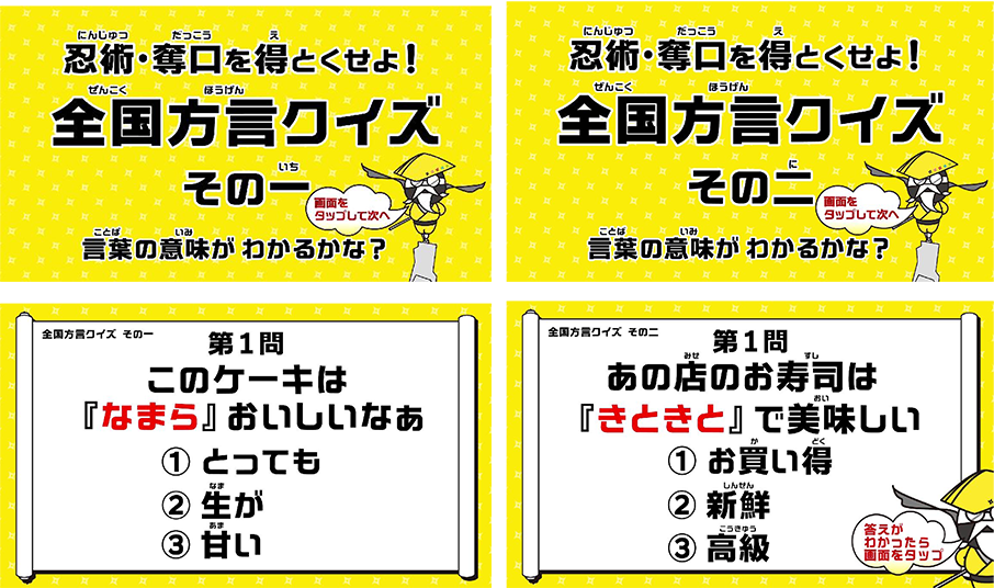 忍者は各地で諜報活動を行う際、現地の方言を自在に操る「奪口(だっこう)」を用いて怪しまれず活動していました。ここでは全国の方言クイズを行い忍者に必要な潜入力を鍛えます。忍者が持っていたモノマネ力をマスターしよう!
