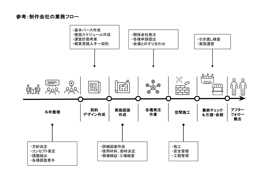 ブースの規模やデザイン内容などにより変わりますが、ブース施工の発注は2~3か月ほど前までにする必要があります。そのためにも、この時期には全体計画や商品展示の方針を決め、施工業者に見積もりをとるなど、確実に対応してもらえるようゆとりをもって進めましょう。チラシやパンフレット、ノベルティなども、この時期にサンプル作成を行いましょう。また、既存顧客への告知や、ターゲット層への告知についても検討を行います。