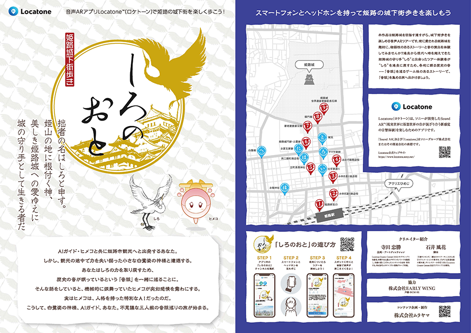 姫路の街に愛される姫路城を題材に、物語性のあるストーリーと音の演出を体験してみませんか?過去から現代へ時を超えてきた姫路城の守り手“しろ”と出会ったツアー体験者が“しろ”を過去に戻すため、各地に眠る歴史の音ーー「音脈」を巡るゲーム性のあるストーリーで、「音脈」を集める旅へ出かけましょう!