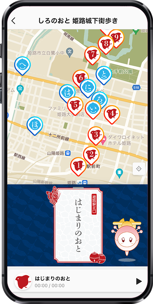 姫路の街を舞台に、過去と未来が交錯。体験者は、スマホから流れる音声に導かれながら街の各所を巡り、姫路城を目指します。体験時間は約1時間。「音脈を集める」というミッションをクリアするごとに、知られざる姫路の歴史が一つずつ紐解かれていきます。
