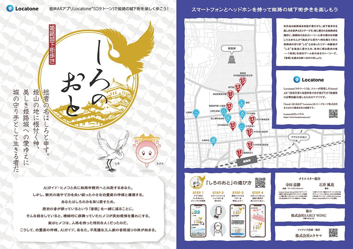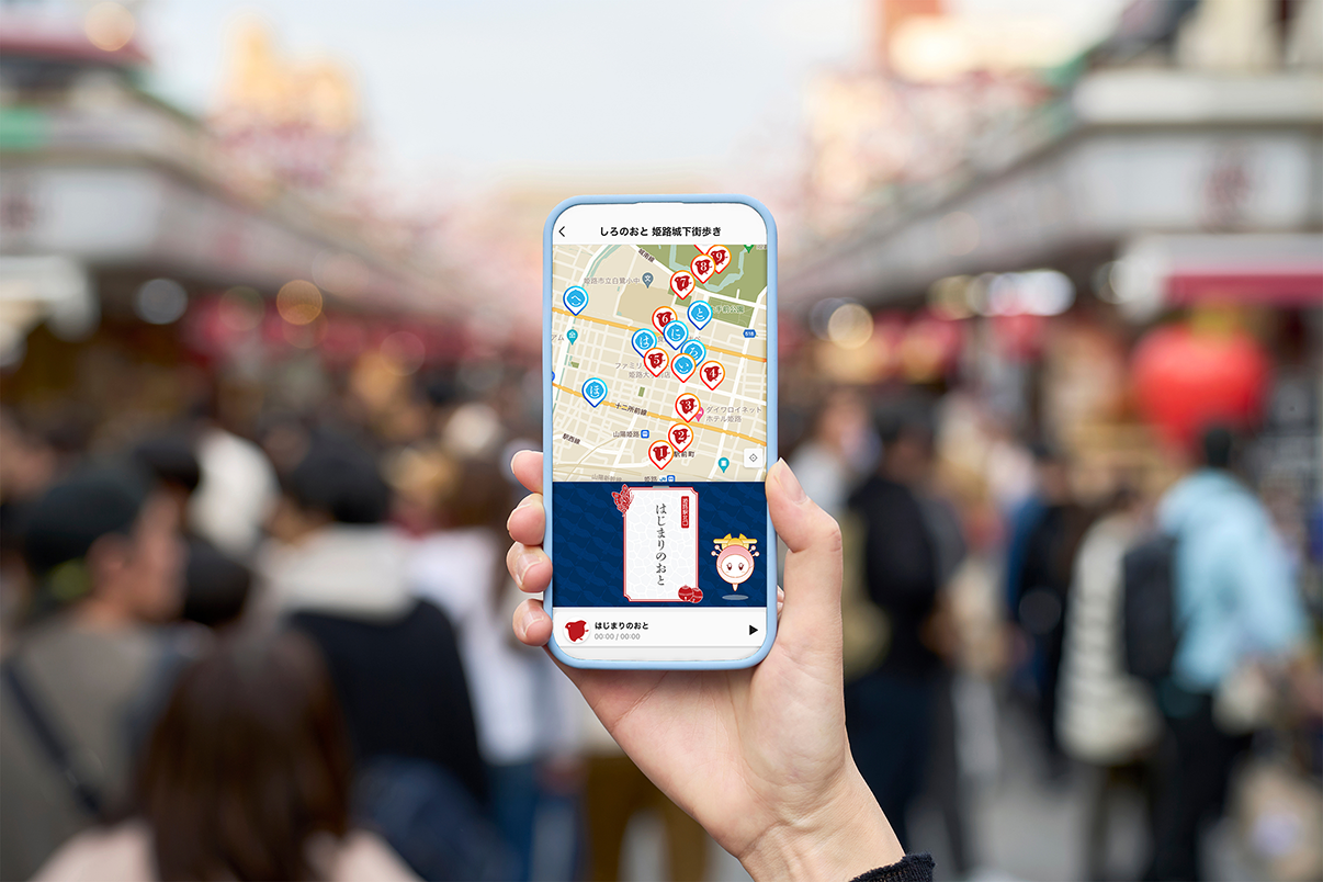 『しろのおと』は、姫路城下に点在する様々な歴史スポットを巡り歩く音声ARコンテンツ。ムラヤマでは、体験デザインのノウハウや心理的な誘導の仕掛けを盛り込みつつ、観光スポットの選定からストーリー構築、実際のコンテンツ制作までを手掛けました。