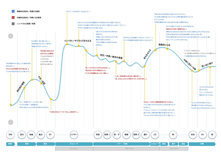 来場者の気持ちの移り変わりをデザインした「ユーザーエクスペリエンスマップ」。見学ツアーの魅力を最大化することはもちろん、ツアー終了後に「ANAで旅したい!」と思っていただくまでをゴールにしています。