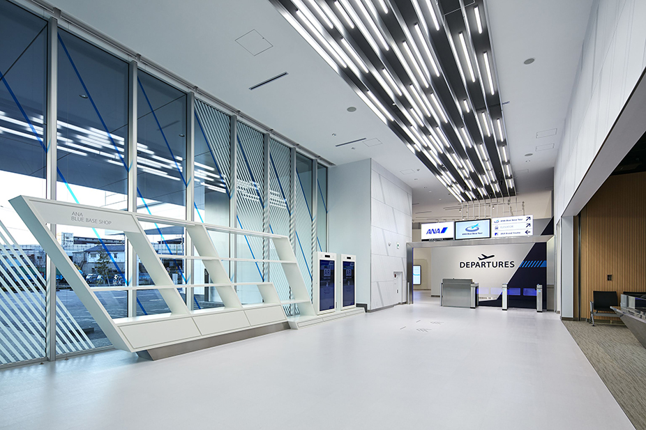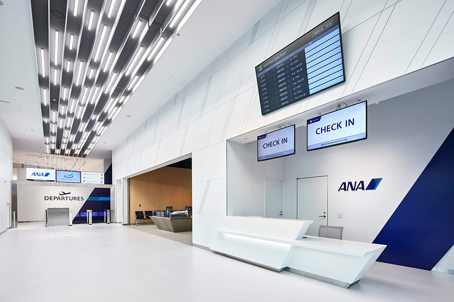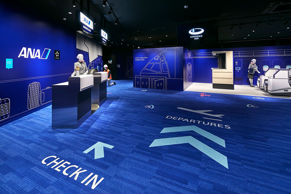 空港をモチーフにトリトンブルーで染められた空間デザイン。実はカラーリングに加えて、もう一つ、ANAらしさを演出する仕掛けが……。