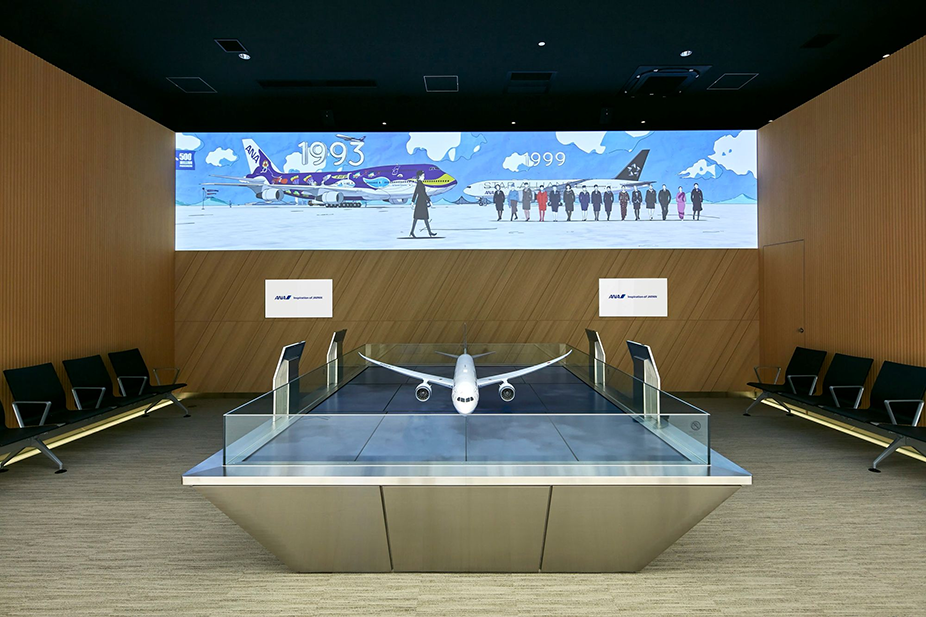 エントランスの背景には、ANAの創業以来の歩みを描いたアニメーション映像が流れます。ワンカットでゆったりと展開する映像は、まるで大きな飛行機が窓の外を横切るような感覚。ANAの歴史を伝えるコンテンツであると同時に、空港らしいアンビエントを生み出す演出でもあります。