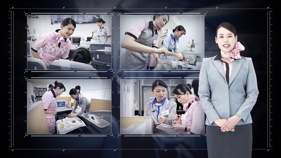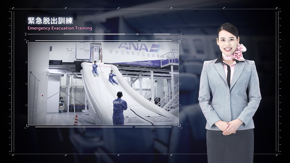 見るだけでなく、ANAのスタッフが大切にする「安全・安心で快適な旅」への想いも伝えたい。本来であれば実際に対話することが一番ですが、訓練中はそうもいきません。そこで、現場で働く様々なスタッフが実際に出演する訓練解説映像を制作。ツアーナビゲーターが解説するだけでなく、スタッフ自身が見学者に直接語りかけるような演出も盛り込むことで、ANAブランドらしい“人を感じる”コミュニケーション体験を提供しています。