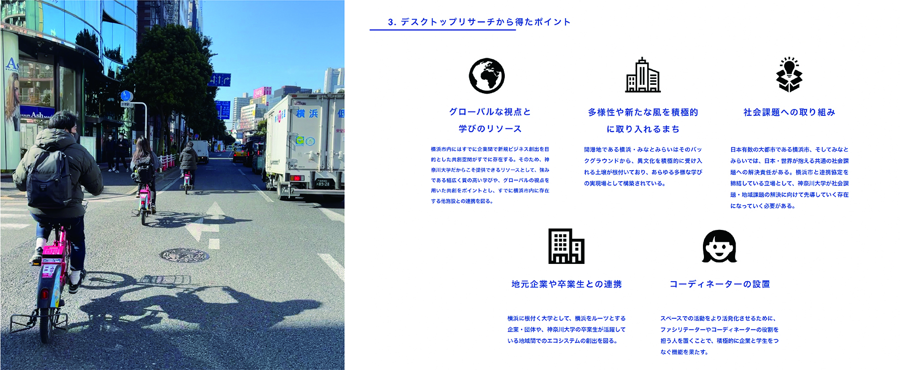 ルールブックの制作にあたっては、学内関係者の考えや想いをヒアリングするとともに、周辺地域を歩いてその土地の個性や可能性などを把握する「フィールドリサーチ」や、既存のイノベーションスペース等の先行事例を調査する「デスクトップリサーチ」も実施。主観と客観(理想と現実)の両面から「あるべき姿」を浮かび上がらせていきました。