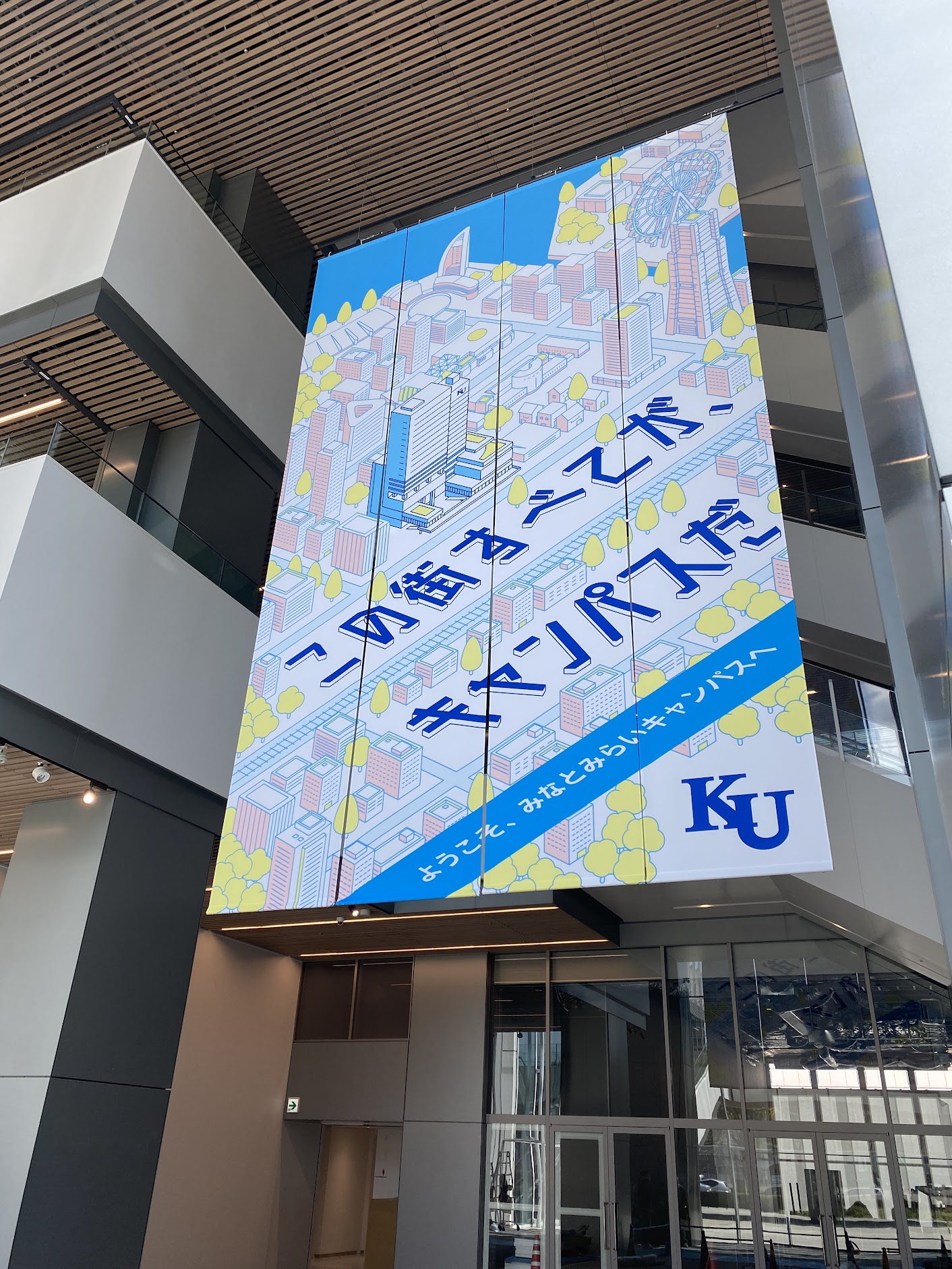 バナー制作においては、単なる旗印としての枠を超え、ソーシャルコモンズの意味や意義を内外に伝える「コミュニケーションツール」としての開発を提案。キャンパスと街の垣根をなくし、みなとみらい全体が学びの場になってほしい。そして、その一員として、神奈川大学はすべての人に開かれたキャンパスでありたい。そんな想いや願いの伝わるバナーをつくりあげました。