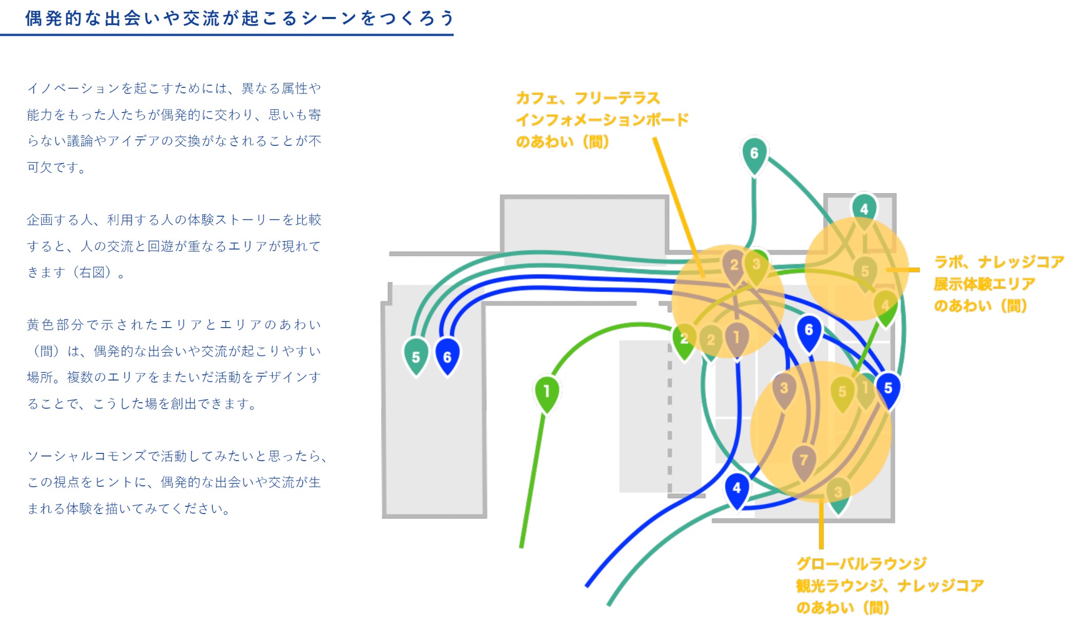 特定の目的に沿って活用シナリオ(ストーリー)を描くことに加えて、このルールブックでは「偶発的な出会い」も重視。それぞれ目的の異なる人と人が交わる場所を可視化することで、想定外のストーリー展開(思いもよらない出会いや交流)を誘発する仕掛けづくりをサポートしています。