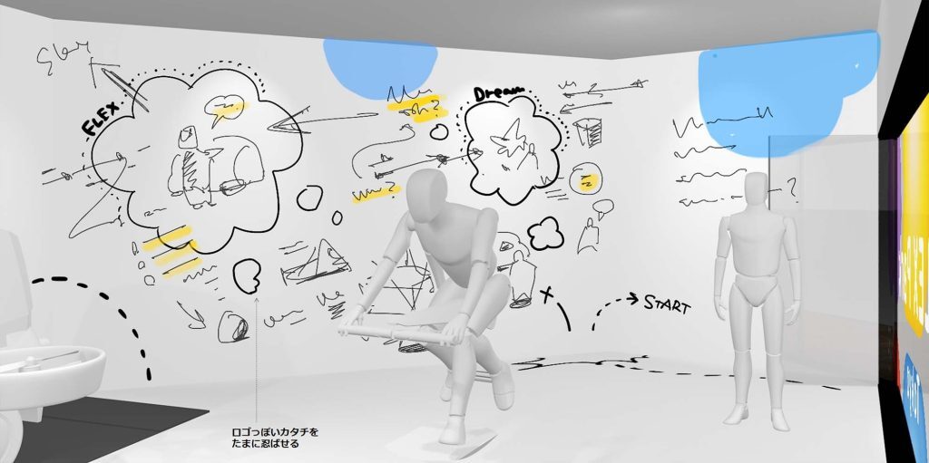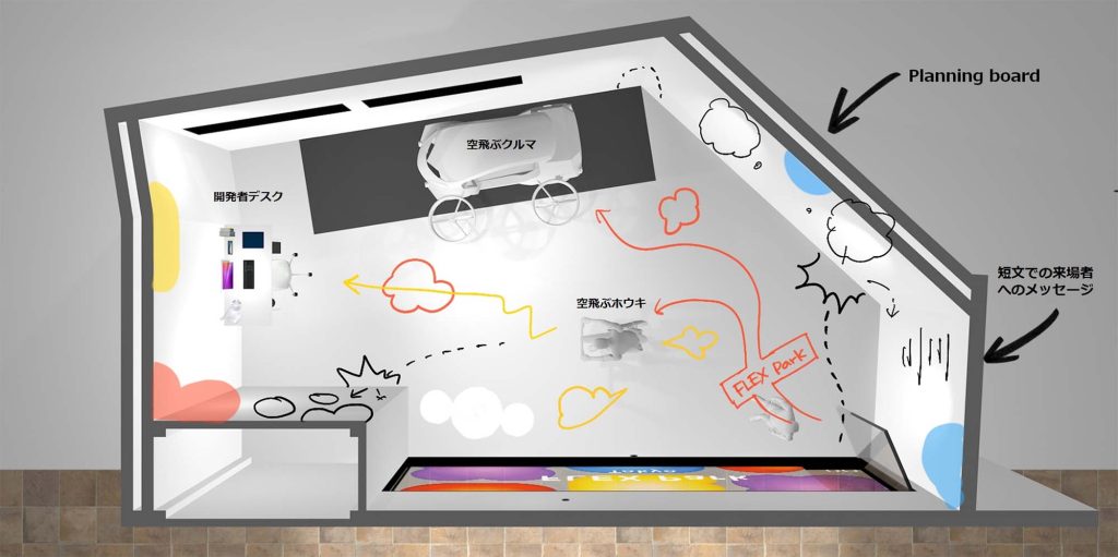 体験設計が固まったら、次はいよいよデザインに着手。当初、デザインに関しては2つの方向性がありました。一つは、未来からタイムスリップしてきたラボというイメージで、少しテクノロジー感の強いもの。もう一つは、あえて手作り感を出した柔らかい雰囲気のもの。最終的には「みんなが身近に感じられる場所にしたい」ということで後者の案が採用となり、さらにそこへDream Onのメンバーのアイデアもプラス。ガラス越しに中が透けて見えるようにしたり、「落書き」を床や壁のデザインに盛り込んだり、みんなが気軽に未来を体験できる場所にしたいという想いをカタチにしていきました。