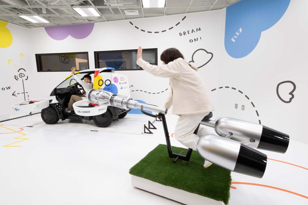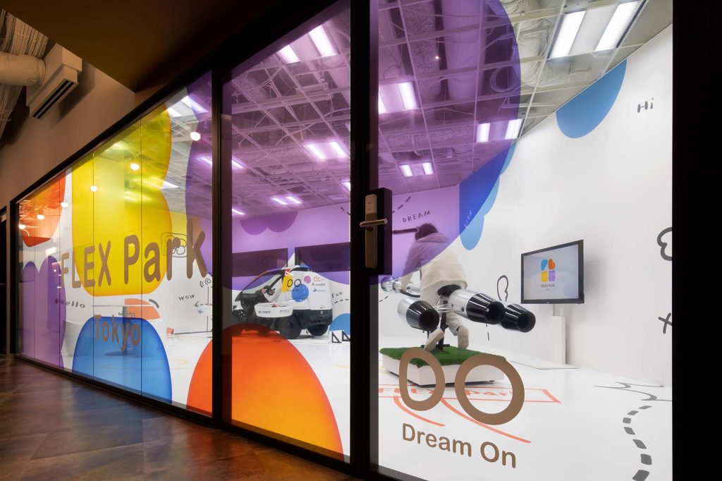 空飛ぶクルマや空飛ぶホウキなど、Dream Onが思い描く未来の世界やプロダクトを仮想体験できる場所「FLEX Park Tokyo」。ムラヤマは、空間・体験デザインをはじめ、ビル会社等との調整や資材提供の交渉など、様々な面でサポートしました。