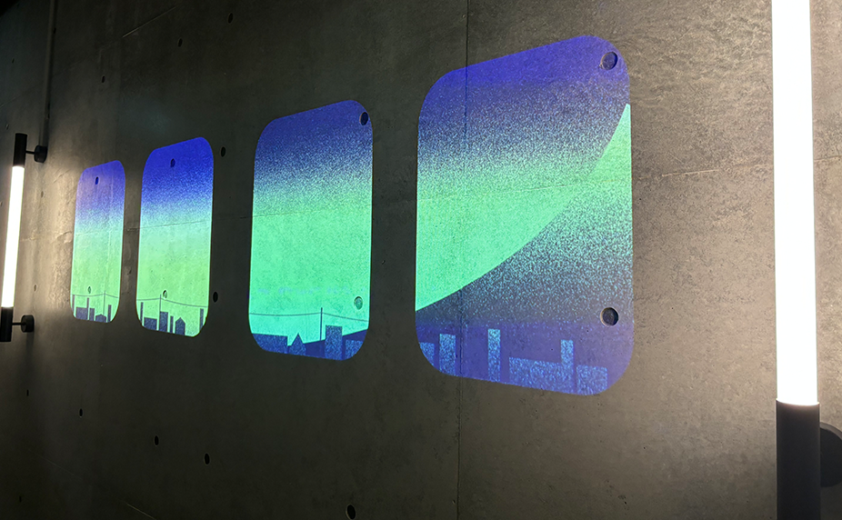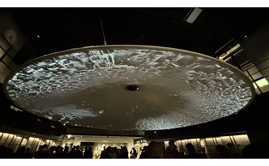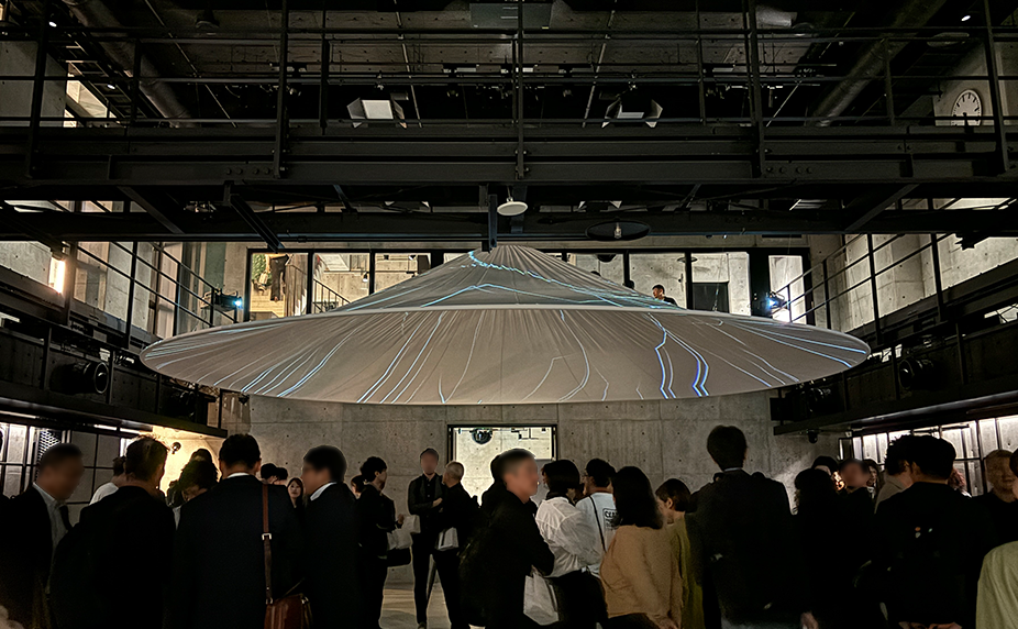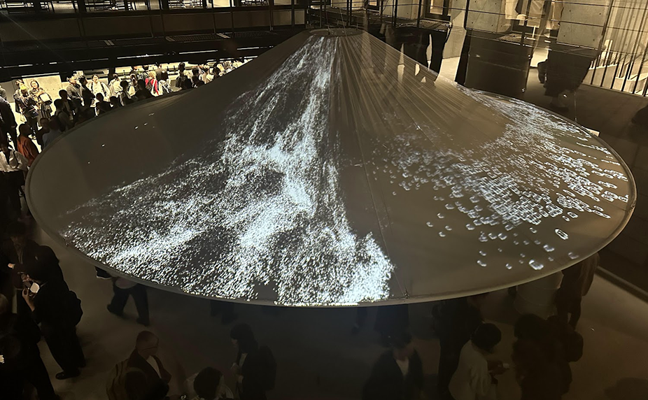 地下フロアへの動線は雄大な富士山を見下ろす展望台のようになっていました。 富士山のスクリーンには様々な山の表情がジェネラティブアートで投影されています。