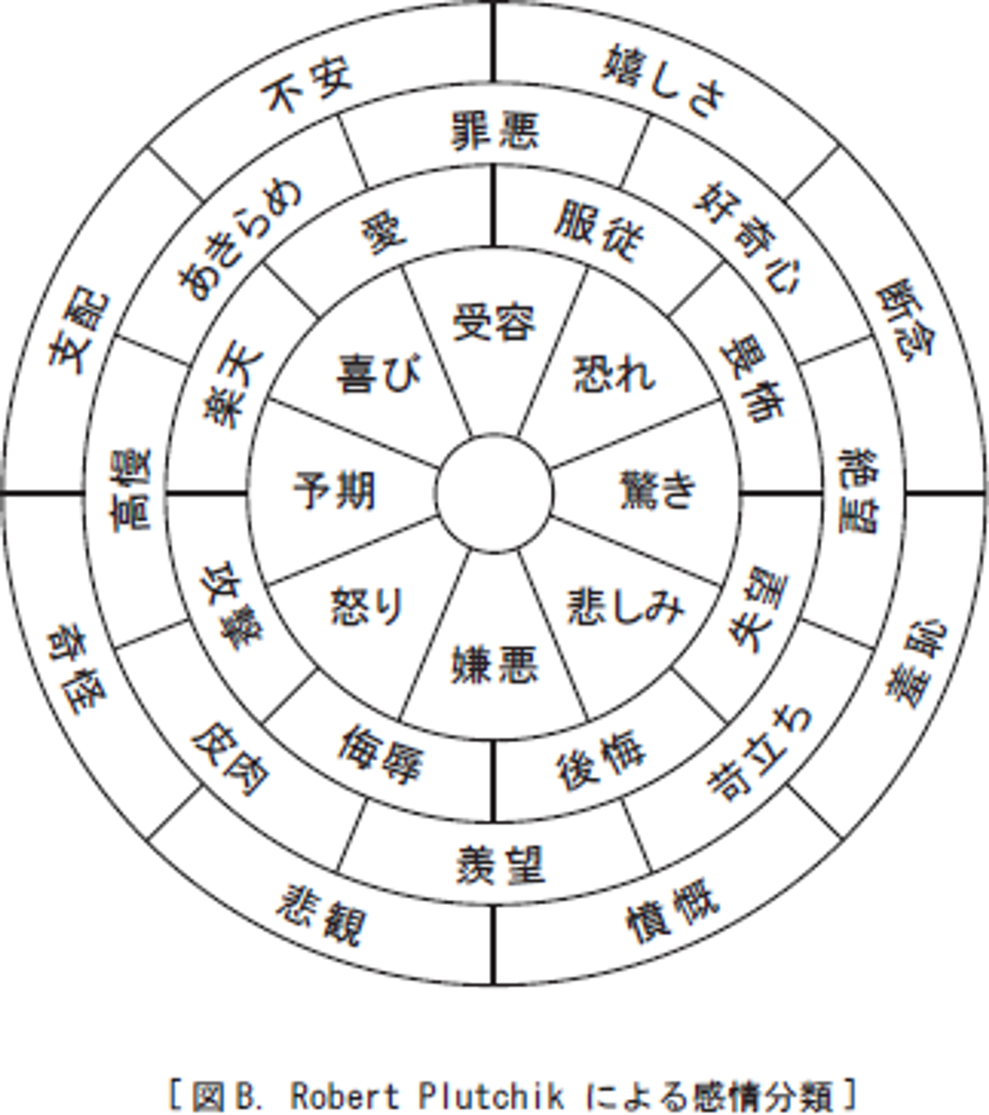 人の感情を喜怒哀楽といいますが、心理学では驚き、喜び、怒り、恐怖、悲しみ、嫌悪の6つを基本感情とします。これらは単独で表出されることはなく、複数の感情が混ざりあった混合感情として表出され、それは30種類余りになります。(図B)