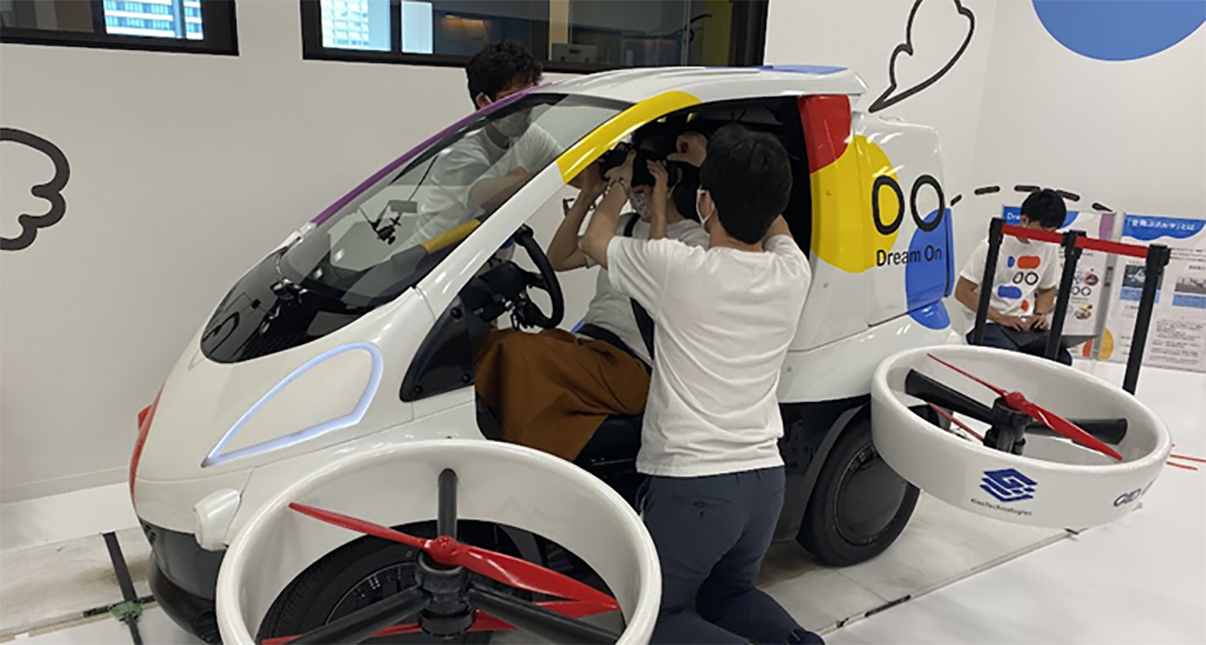 VR体験機は一人乗りEVが改造された車体で、体験者は乗車後にVRゴーグルを装着。目の前には東京都心の街並みがリアルに再現され、設定されたコースをフライトします。映像に合わせ車体は前後に移動し内蔵されたファンが風を吹かす、この絶妙な組み合わせにより乗車した者は空を飛んでいるような浮遊を体感できます。