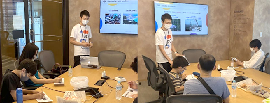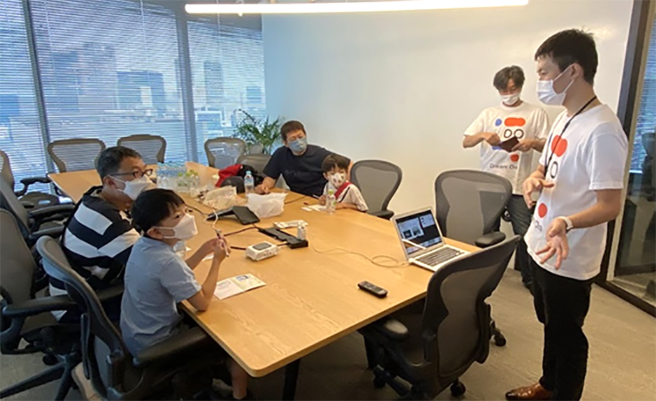 夏休みの⾃由研究の特別企画として、空飛ぶクルマのVR体験機試乗会と勉強会が親子向けに開催されました。場所は虎ノ門のベンチャー企業・団体が拠点を置くビルの一角『FLEX PARK Tokyo』。シェアオフィスが並ぶフロアで異彩を放つ、白い落書き帳のような空間です。