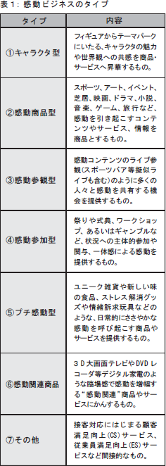ところで、この感動市場を構成するビジネスは、おおむね7つのタイプに分けられます。(表1)