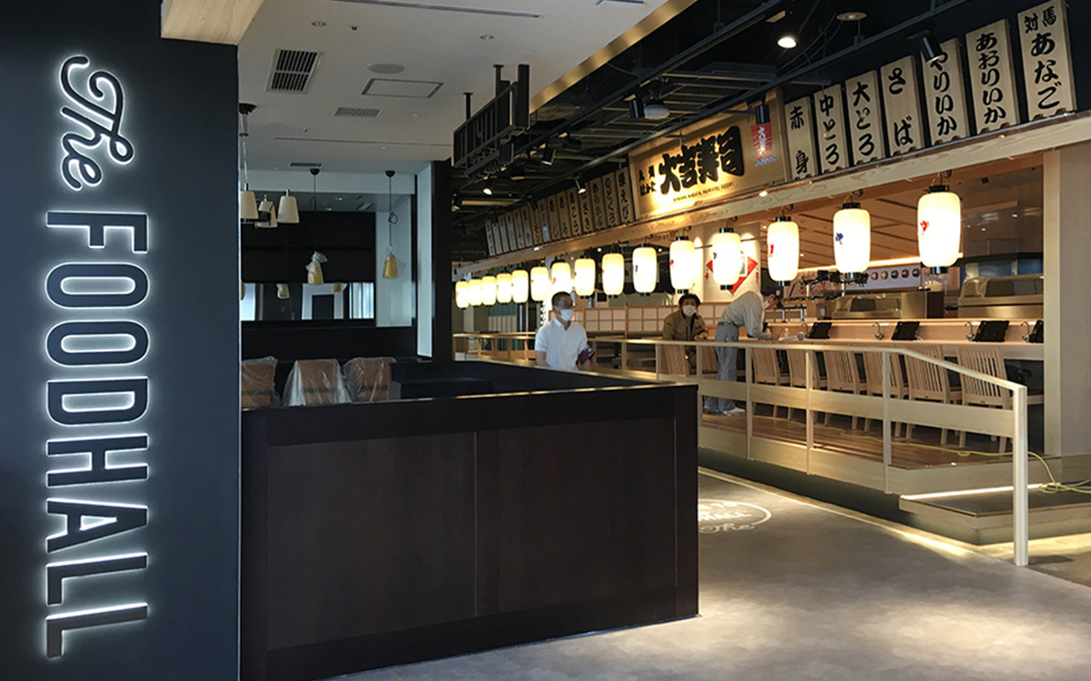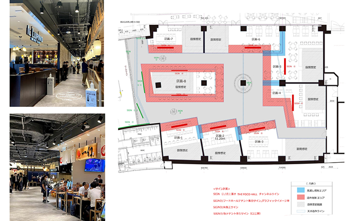| 業務範囲 | デザイン・設計・施工・サイン・内装設計指針諸策定・環境調整管理業務(フードホール内装監理) |