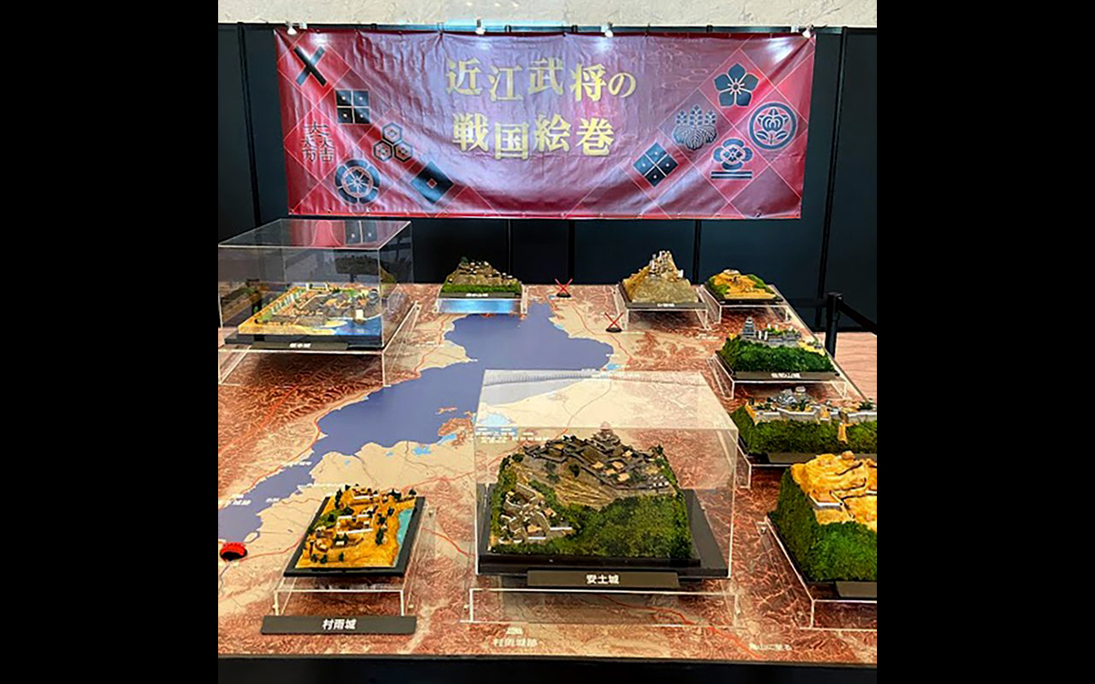 お城EXPOで、老若男女問わず最も人気のあるお城のジオラマ模型コーナー。今回は滋賀県の地図の上にレイアウトしました。