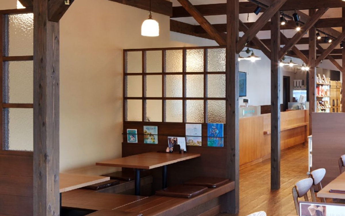 小上がりスペースでは海に関する書籍の閲覧が可能。豊かな海とお店のつながりを印象付ける演出です。