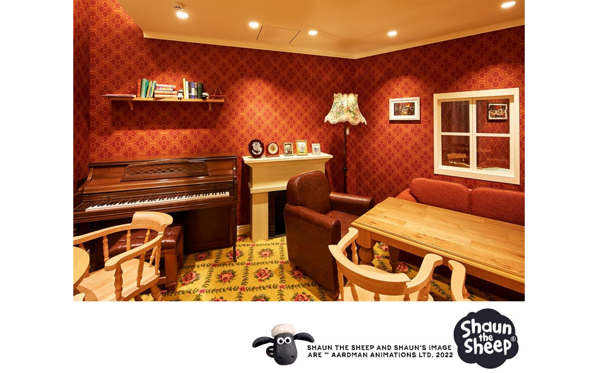 カフェスペースは「牧場主が留守の間にショーンたちがこっそりパーティーの準備をしている」というストーリーで演出。キャラクタターの仲間になった気分でお茶を楽しめます。 (写真内のジオラマはアードマン・アニメーションズにより製作されたものです)