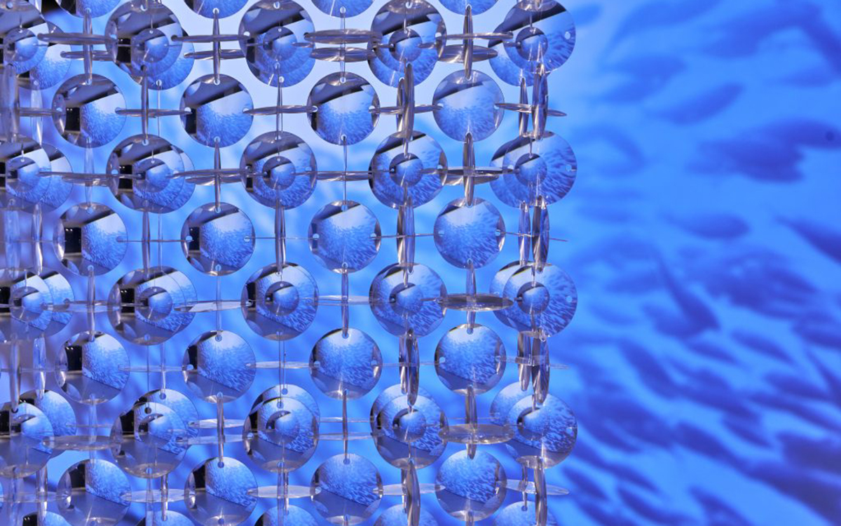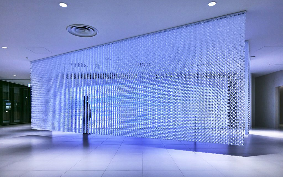 コーポレートステートメントである「小さな技術がつくる大きな世界」を表現すべく、精密かつダイナミックなアート空間を提案。建築家の沖津雄司氏とコラボレーションし、レンズを用いたオブジェと映像によるインスタレーションを制作しました。
