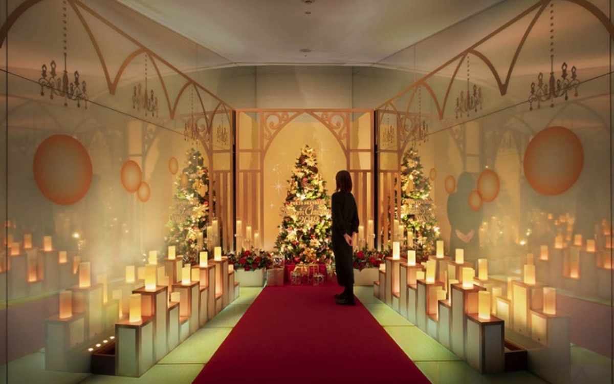 クライマックスは無数のキャンドルに囲まれたチャペルのような空間。幻想的な光と装飾が「永遠の願い」を彩ります。